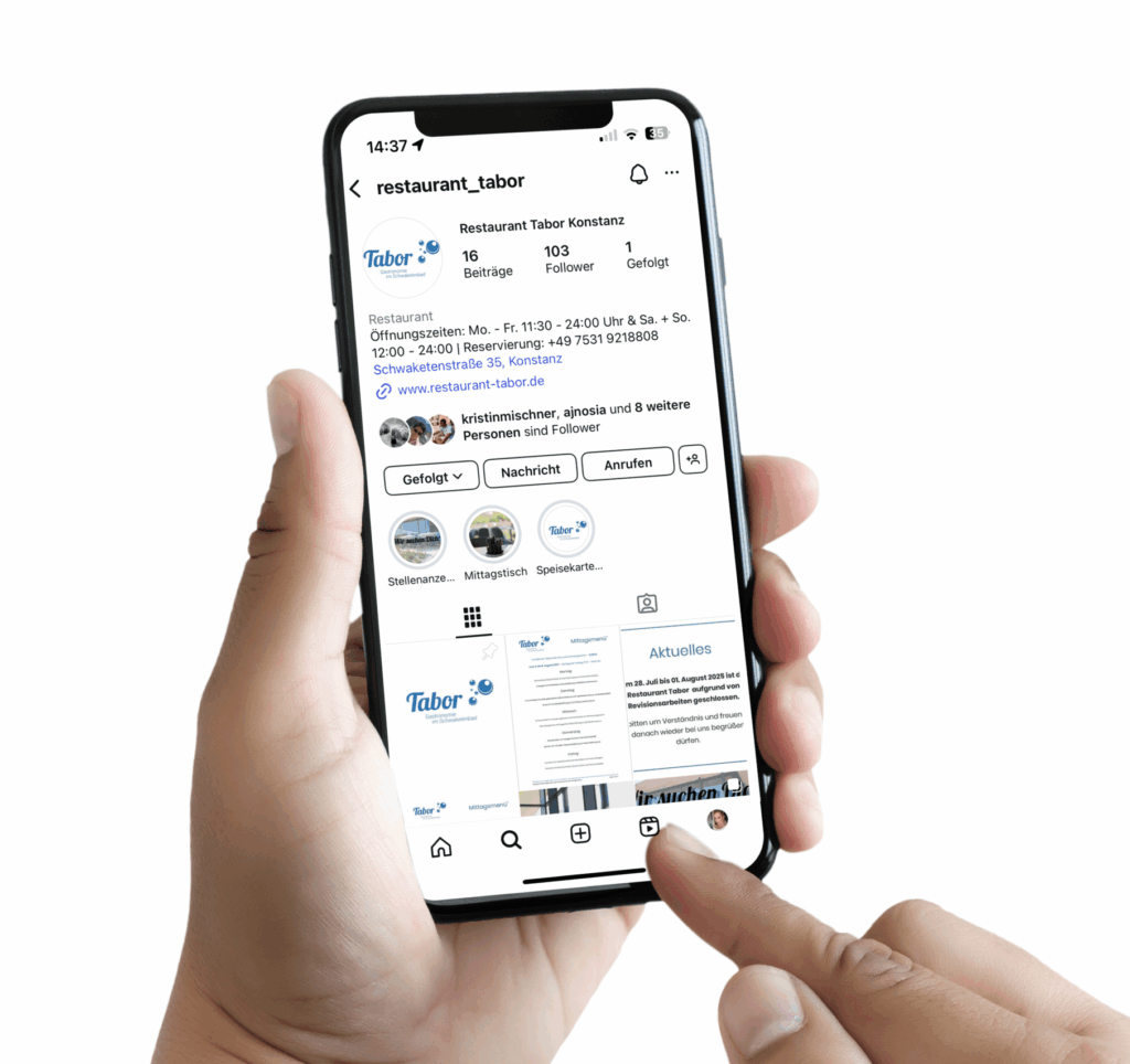 Für das Restaurant Tabor betreue ich die Social-Media-Kanäle mit Fokus auf einer warmen, einladenden Bildsprache. Regelmäßig werden aktuelle Mittagsmenüs und ausgewählte Gerichte präsentiert, um Gästen schon digital Appetit zu machen und die kulinarische Vielfalt sichtbar zu machen.